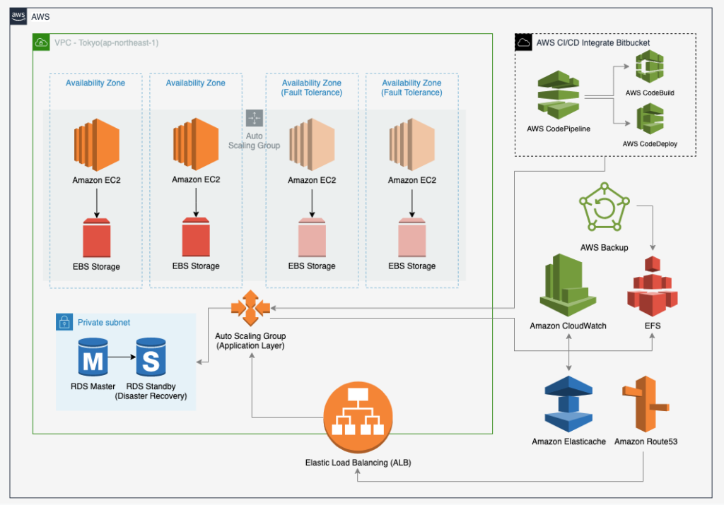当システムは、AWSの東京リージョンにおいて、複数のアベイラビリティゾーンを用いて構築しています。