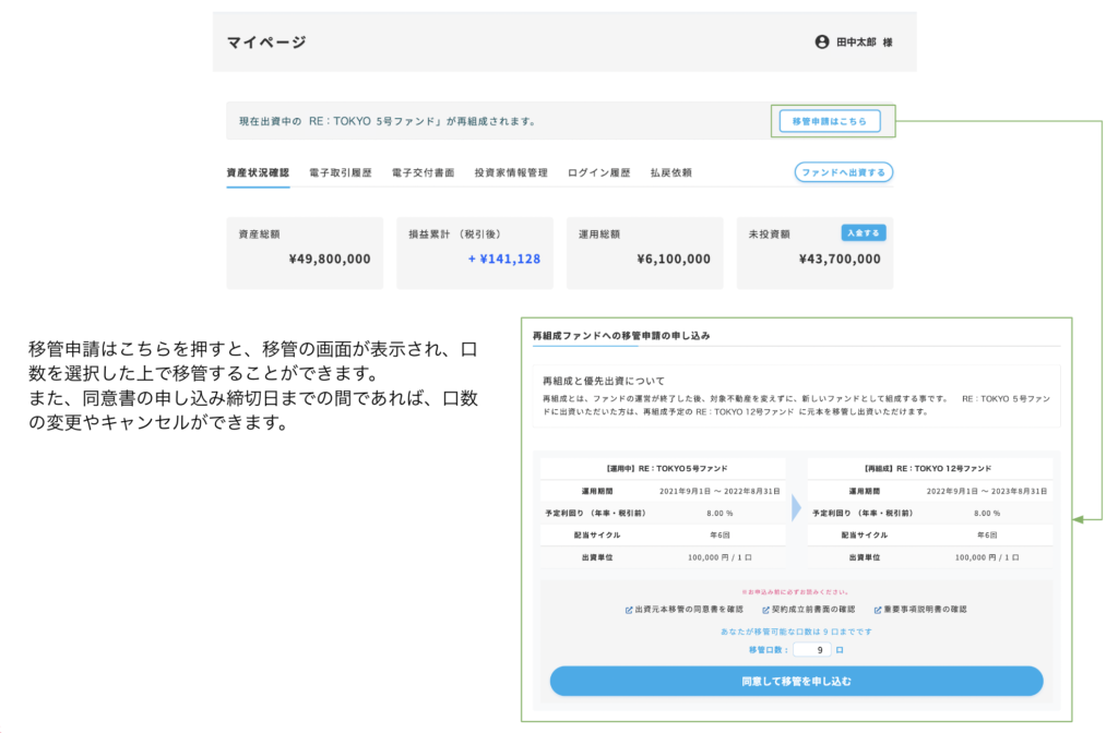 再組成を実行すると、そのファンドの出資者へ通知し、マイページより再組成したファンドへ元本を移管することができるようになります。これにより、会員は継続して同じ不動産へ出資することができます。