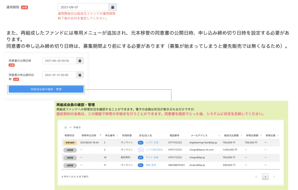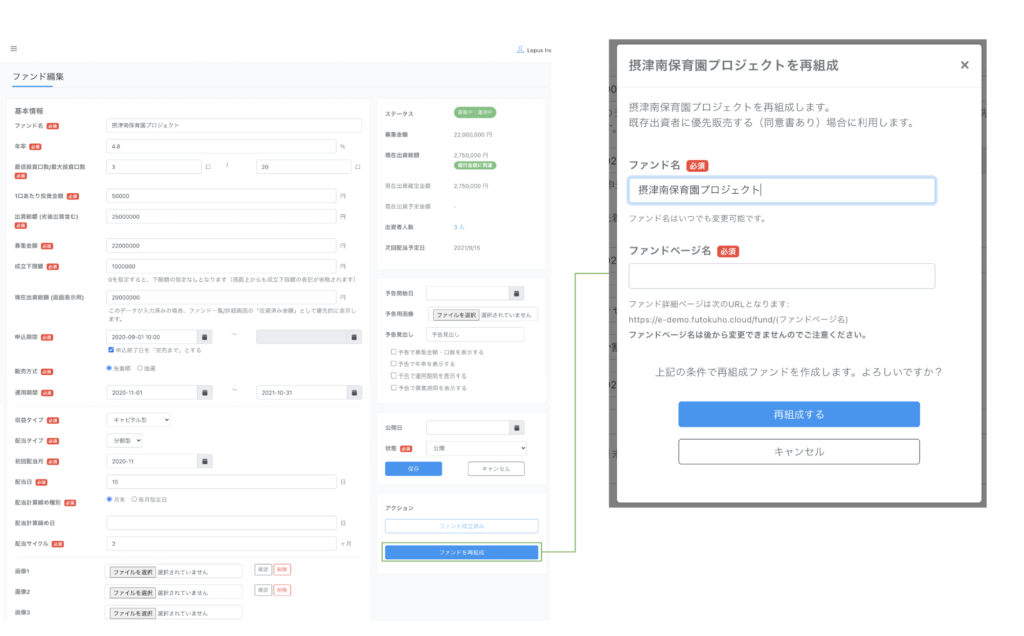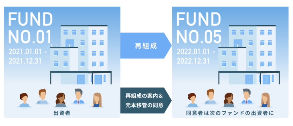 再組成は、運営が終了する予定のファンドを再組成し既存出資者に優先販売できる機能です。