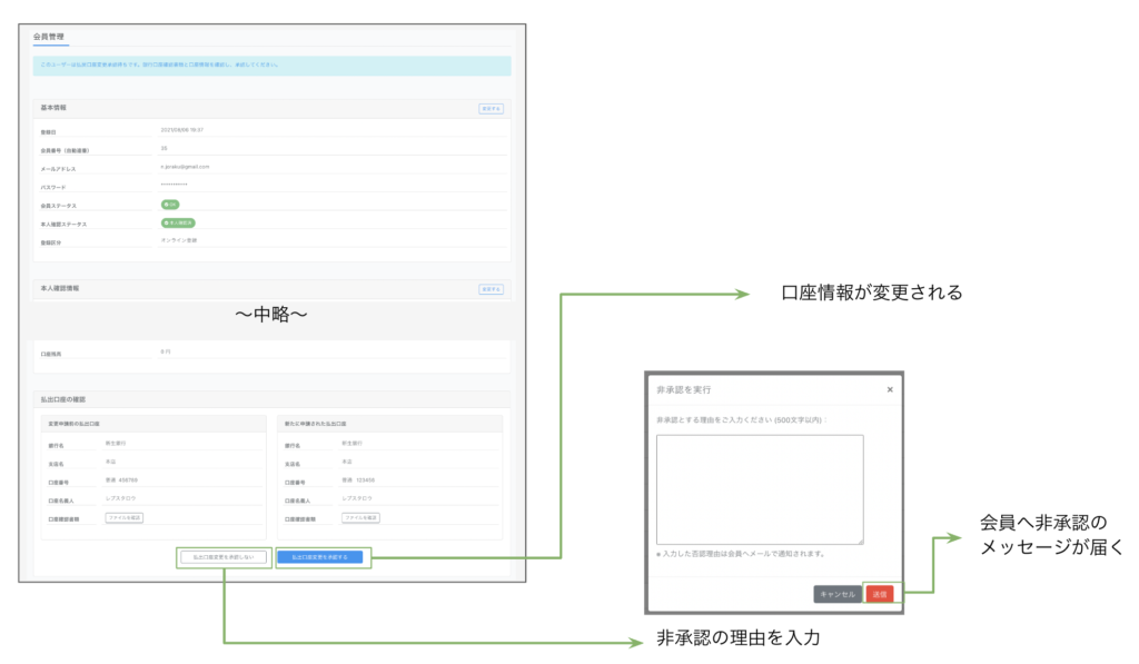 変更申請前の口座情報、変更申請された新しい口座情報が表示されますので、新しい口座に問題がないか確認し承認してください。