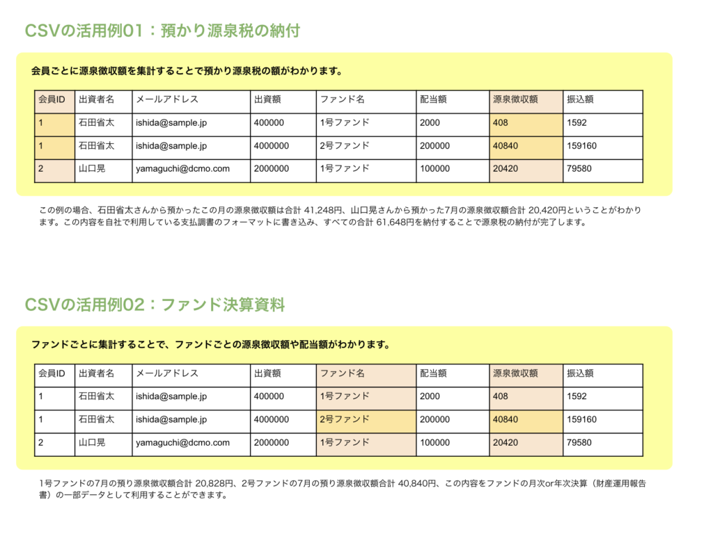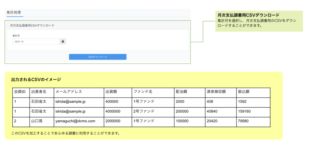 集計処理では、支払調書やファンドごとの決算資料の金額の集計に利用できるCSVデータがダウンロードできます。
