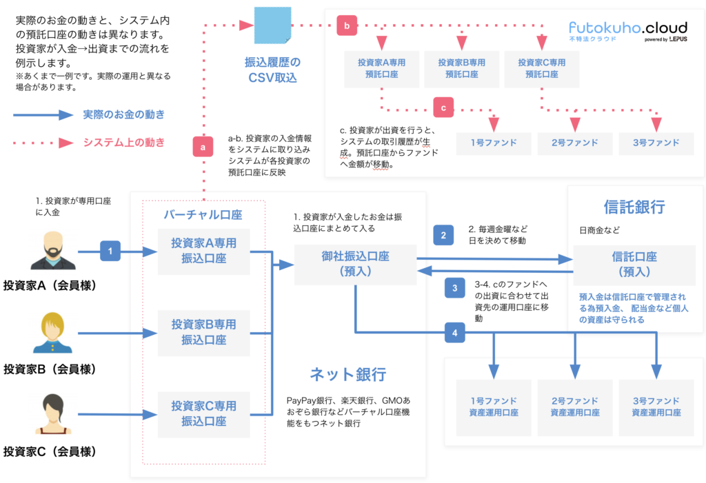 一般的に、振込専用口座に振り込まれた現金は代表口座にまとまって入金されます。ここに入ってくる現金は出資前の預託金のため、すべて信託銀行に移し信託保全をおこないます。