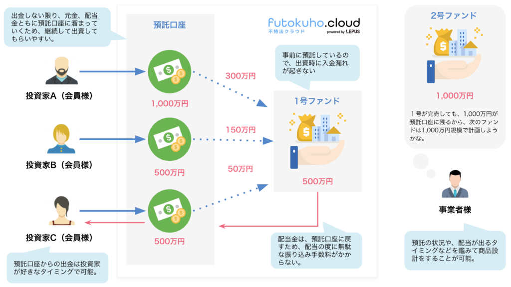 預託口座機能は、システム側に会員ごとの口座を持たせる機能です。会員は預託口座お金を入金することで、各ファンドに出資することができます。例えば、預託口座の残高を見て次のファンド規模を検討したり、大型のファンドの償却タイミングに合わせて、魅力的なファンドを用意することで別の投資商品に流れないようにするなど、ファンドの運営をより戦略的に行うことが可能です。(預託機能には1号+2号免許が必要です)