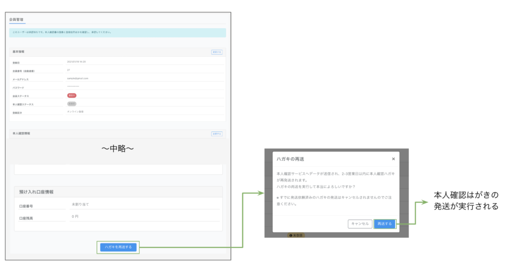 承認した後、ハガキの再送ボタンが表示されます。通常使うことはありませんが、会員がハガキを受け取ったものの紛失したなど、再送するしか方法がないような場合に利用いただけます。